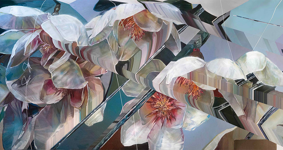 Magnolias, a Vancouver icon, are poised in a reflective geometric landscape of mirrors, echoing the downtown skyline. The two create a dichotomy between our proximity to our beautiful Pacific Northwest backdrop and our ever-evolving metropolis. This is further echoed using a contemporary take on classical painting techniques joined with digital influences to plant the work with one foot in the past, and the other in the future.