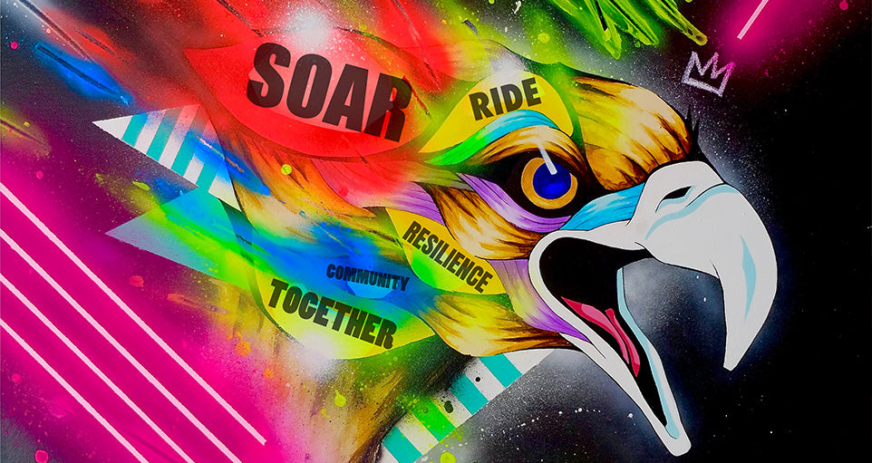 Urban and organic elements intertwine with playful charm on the wall. Watch as abstract shapes, adorned with neon and neutral colours, come together to form the iconic bald eagle, symbol of Vancouver FC. With vibrant neon wings, the eagle soars with energy and passion, symbolizing the strong connections within our community. This artwork celebrates the fusion of our urban landscape and the natural world, inviting you to embrace the spirit of unity and joy.