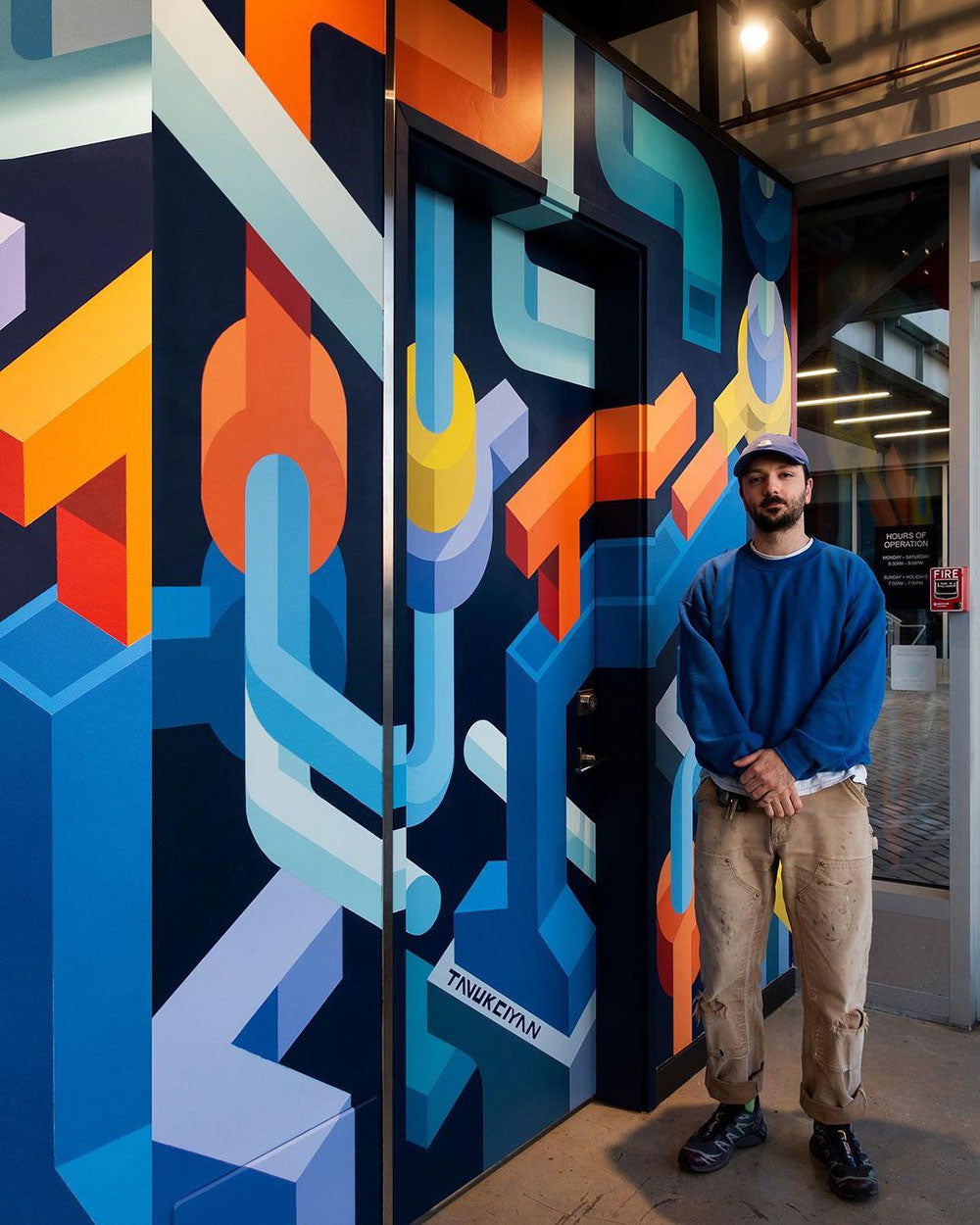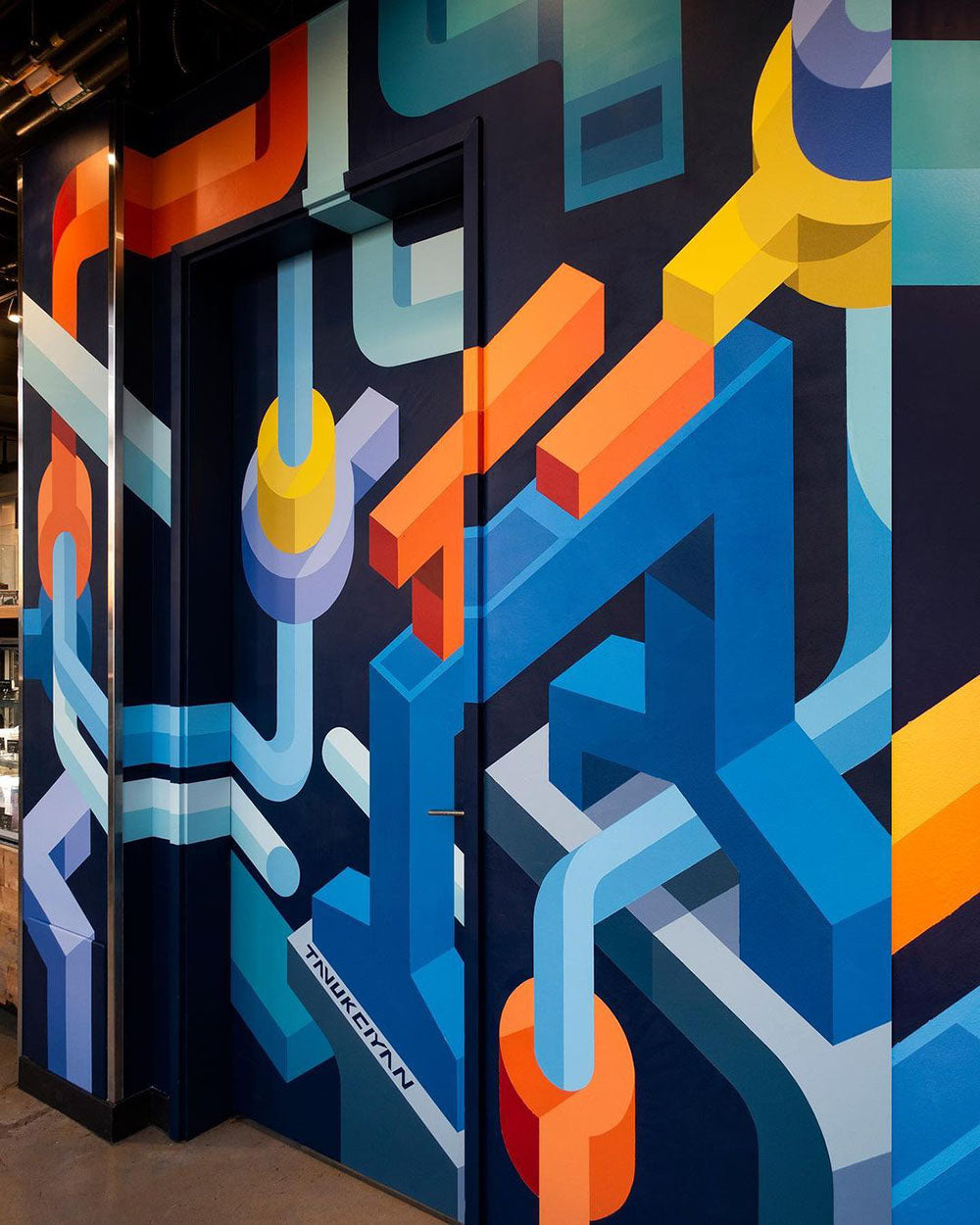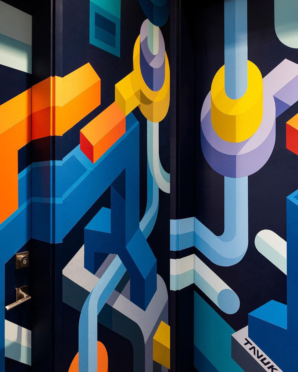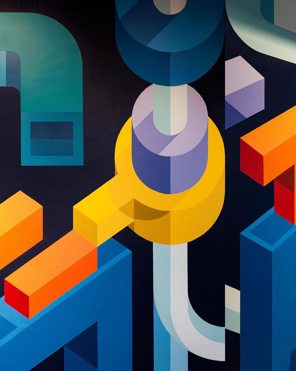 Continue ShoppingThe concept for this mural was to come up with a location specific design as a way to reflect and capture the spirit of The Shipyards community surrounding Artigiano. To gather inspiration for the design I walked around The Shipyards taking photos of specific forms that caught my eye, curating a selection of industrial and shipyard related motifs to be abstracted. The resulting composition is an assortment of those abstracted elements intertwining, connecting and branching on one another to illustrate the vibrant expansion and evolution that The Shipyards District has undergone over the past few years.
